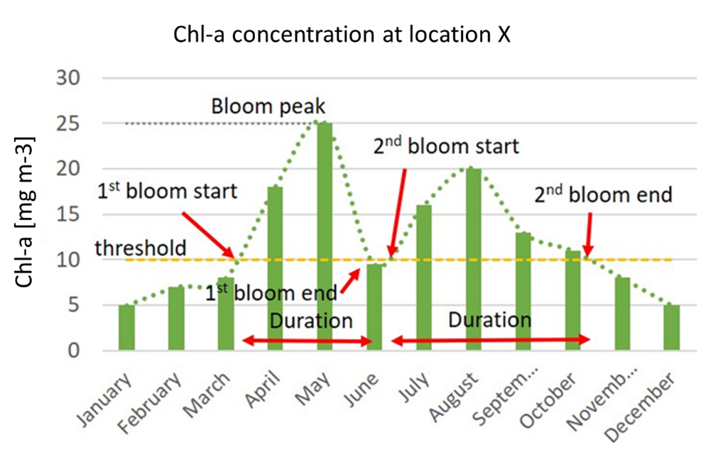 CoastObs bietet Ökologen und (inter-)nationalen Wasserwirtschaftsbehörden jährliche Informationen. Die folgenden phänologischen Metriken für die dominante Phytoplanktonblüte können erstellt werden: