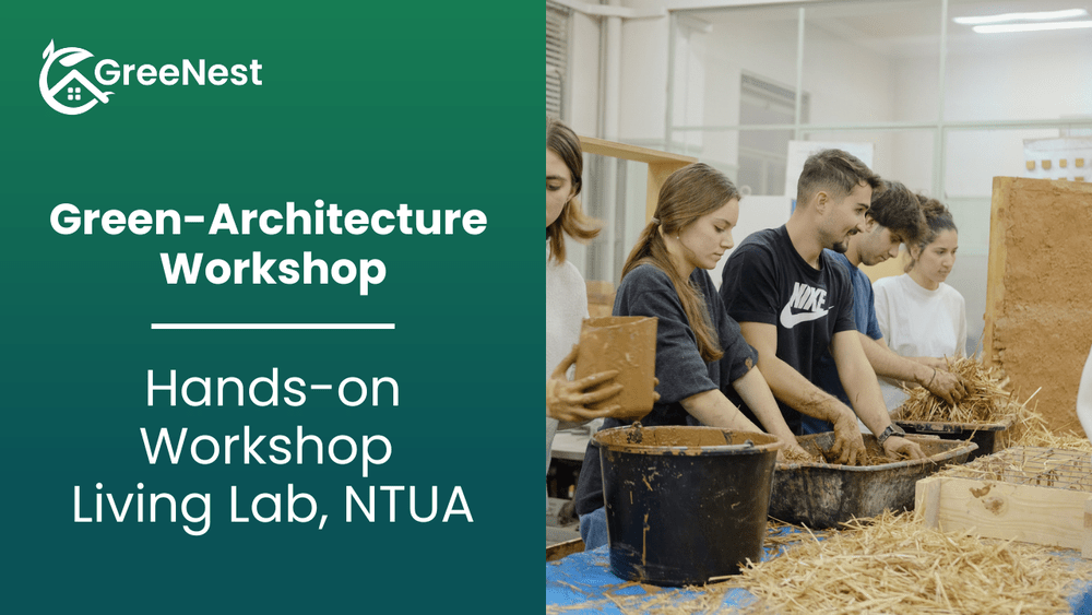 The first hands-on workshop of the GreeNest project, held at the Building Materials Laboratory of the National Technical University of Athens. The workshop brought together 30 architecture students to explore natural materials and sustainable construction techniques. The focus was on both education and experimentation, equipping future professionals with practical skills and a deeper understanding of ecological building approaches.