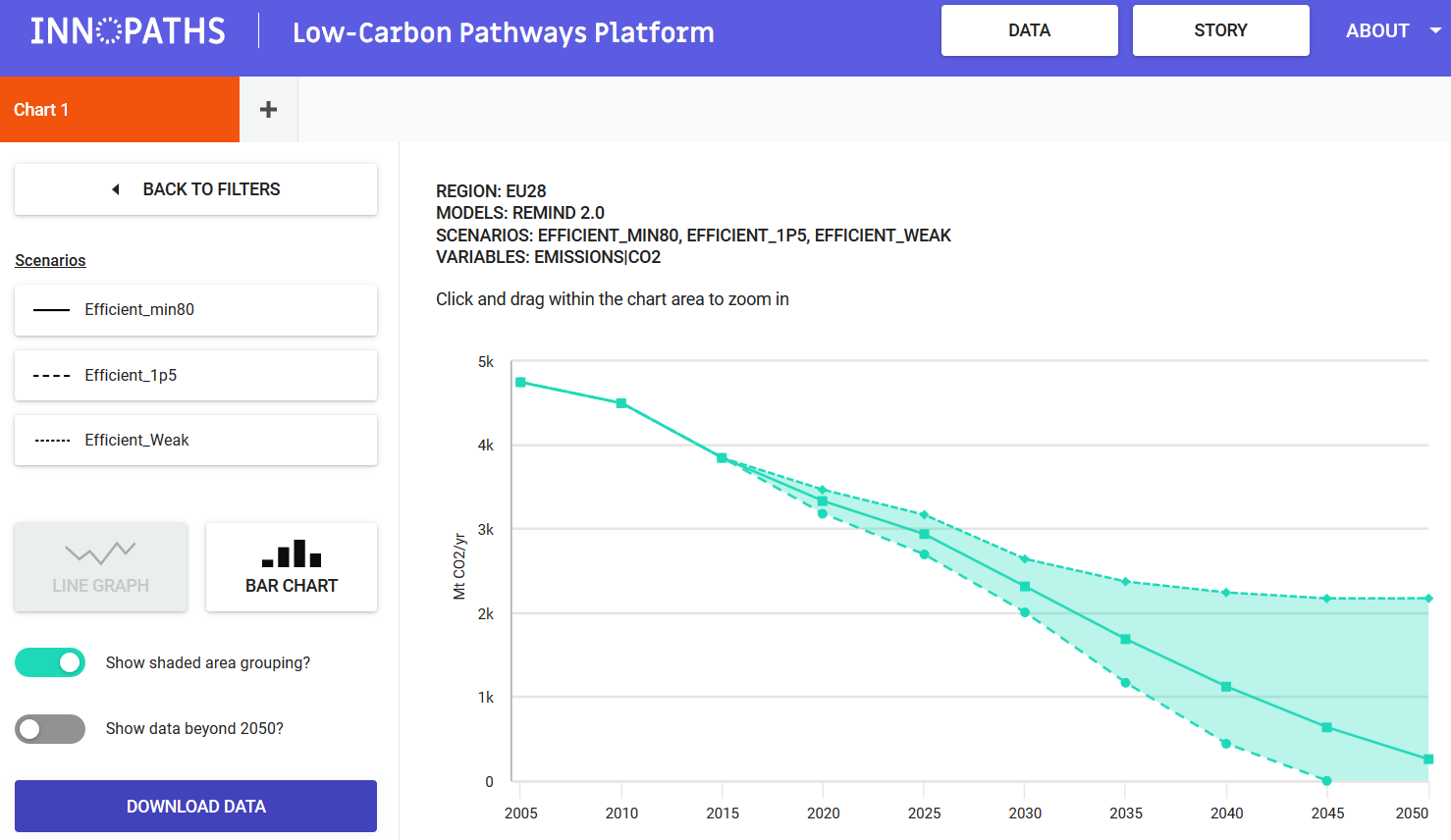 The Low Carbon Pathways Platform allows users to easily explore different ways how our society can deeply decarbonize over the next decades. Scenarios for different emission reduction ambitions were calculated using state-of-the-art energy-economy-climate models. The online platform is built to allow decision-makers easy access to the information that matters in the process of achieving a low-carbon economy (future energy use, emissions, technology deployment, energy prices, etc. in different sectors). The results can be displayed and compared in a variety of ways. Potential users include a) the strategy units of companies that want to explore future demand for their products and services, as well as expected ranges of CO2 and energy prices; b) planning and policy units in ministries and administrations; c) investors trying to identify key technologies needed in low-carbon economies. The link to the tool will be provided once it is publicly available.