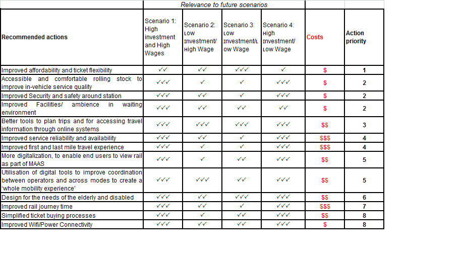 Recommendations included actions to improve affordability and ticket flexibility, safety and security and facilities around stations, rolling stock comfort and trip planning tools. More costly recommendations included improving reliability, frequency and first and last mile travel experience. An impact assessment based on a 10% improvement in a quantifiable subset of these recommendations found scope for extensive benefits with an estimated 25-37% demand uplifts where all identified improvements were implemented. Uplifts were lowest for light rail and highest for longer distance rail. A lower cost scenario found uplifts of 9-12%. Whilst uplifts are driven by fare and GJT changes, our findings suggest role for improvements in ‘softer’ factors such as crowding, vehicle cleanliness, station environment and first/ last mile experience.